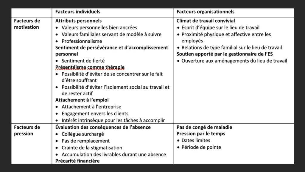 When problems arise2 physical or psychological health problems, you have the choice of being present at work or missing work. The first alternative describes presenteeism, i.e. working despite health problems. The second refers to sick leave (hereinafter referred to as absenteeism). ), or not showing up to work for health reasons. Simply put, these behaviours are complementary rather than independent (Gosselin and Lauzier, 2011).